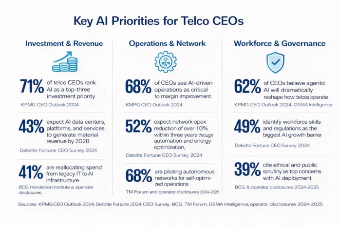 Operational efficiency remains one of the strongest AI value levers in telecom. CEOs increasingly focus on:
